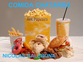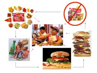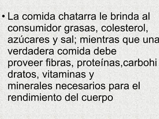 El documento discute los efectos negativos de la comida chatarra en la salud y nutrición de los niños. Explica que la comida chatarra proporciona grasas, colesterol, azúcares y sal pero carece de nutrientes esenciales. También estimula el apetito a través de aditivos como el glutamato monosódico. La publicidad influye en los niños para preferir esta comida. El consumo frecuente de comida chatarra puede causar obesidad, problemas cardíacos y efectos psicológicos