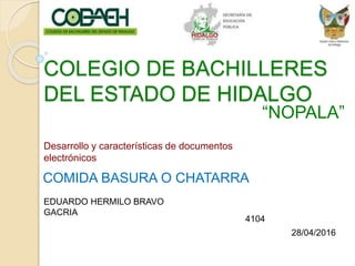 Este documento discute los efectos negativos de la comida basura o comida chatarra en la salud. Explica que aunque todos los alimentos pueden ser perjudiciales en exceso, la comida chatarra lo es más debido a la facilidad con que se consume y a menores cantidades requeridas para producir efectos adversos. También enumera algunos de los efectos negativos como estimular el apetito y la sed, causar adicción, reducir las capacidades cognitivas y provocar ansiedad. Finalmente, define una mala alimentación como aquella