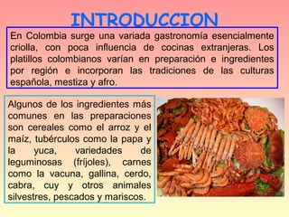 El documento describe la gastronomía de Colombia, incluyendo platos populares como el sancocho, arepas y pastel de tres leches. Explica que los ingredientes principales en la cocina colombiana incluyen maíz, yuca, papas, carnes y mariscos. También describe bebidas típicas como el café y agua de panela, así como postres como las natillas.
