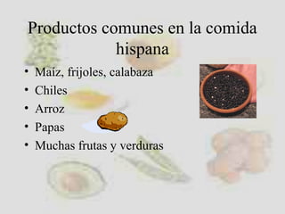 Este documento presenta una descripción general de la comida latinoamericana. Resume los productos comunes como el maíz, frijoles, chiles y frutas variadas. Explica algunos platillos típicos de diferentes países como el arroz con leche, ceviche, arepas y tamales. También incluye consideraciones sobre modales en la mesa de países como México, Venezuela, Ecuador y Argentina.