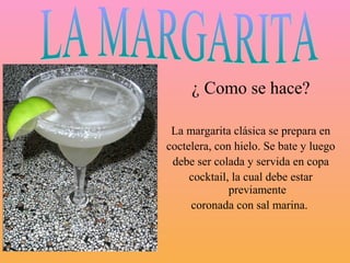 El documento habla sobre la historia y preparación de la margarita clásica. Existen varias teorías sobre su origen, atribuido a Carlos Herrera, Margaret Sames o Margarita Carmen Cansino. Se prepara batiendo ingredientes en una coctelera con hielo y luego colándola en una copa con sal marina.