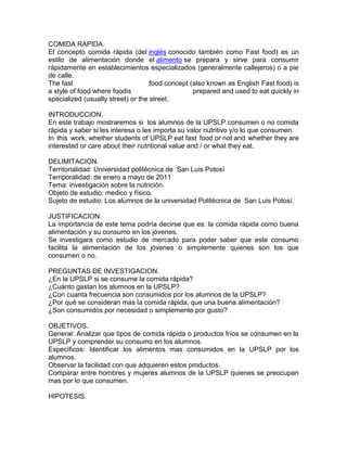 Este documento presenta un estudio sobre el consumo de comida rápida entre los estudiantes de la Universidad Politécnica de San Luis Potosí en México. El estudio encontró que la mayoría de los 357 estudiantes encuestados consumen comida rápida de 2 a 3 veces al día por necesidad más que por gusto y no les importa su valor nutricional. Las mujeres estudiantes mostraron más interés en los ingredientes que los hombres.