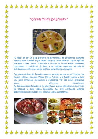 La gastronomía del Ecuador es muy variada debido a sus cuatro regiones geográficas distintas (costa, sierra, oriente e insular), cada una con sus propias tradiciones culinarias. Los platos típicos incluyen guatita, arroz con menestra y carne, caldo de salchicha y ceviche a nivel nacional, así como mochines, corviche y bollo de pescado en la costa, seco de pollo, cuy y hornado en la sierra, y peces en hojas y carnes de la