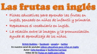 El documento presenta un vídeo educativo sobre las frutas en inglés, diseñado para niños de infantil y primaria. Se enfatiza la importancia de la relación entre imagen y pronunciación para facilitar el aprendizaje del vocabulario en inglés. El contenido es parte de un canal de YouTube llamado British Bubbles.