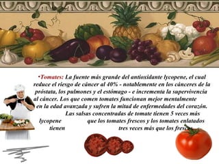 Este documento proporciona 10 alimentos que promueven la longevidad. Estos incluyen tomates, aceite de oliva, uvas rojas, ajo, espinaca, granos enteros, salmón, nueces, arándanos azules y té, los cuales contienen altos niveles de antioxidantes que ayudan a prevenir enfermedades como el cáncer y las cardíacas. Investigaciones mencionadas demuestran que una dieta rica en estos alimentos puede reducir significativamente el riesgo de muerte y mejorar la salud mental
