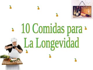 El documento proporciona 10 alimentos que promueven la longevidad: 1) Tomates, ricos en licopeno que reduce el riesgo de cáncer; 2) Aceite de oliva, que reduce muertes por enfermedades cardíacas y cáncer; 3) Uvas rojas y jugo de uva, altos en antioxidantes; 4) Ajo, con propiedades anticancerígenas, cardioprotectoras y antioxidantes; 5) Espinacas, ricas en nutrientes protectores contra cáncer y enfermedades; 6) Granos enteros, que reducen