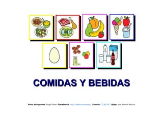 El documento presenta una serie de pictogramas relacionados con comidas y bebidas creados por Sergio Palao bajo licencia CC BY-NC para ayudar a la comunicación. Incluye imágenes de alimentos como frutas, verduras, carnes y postres, así como bebidas como agua, jugos, café y té.