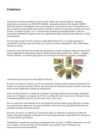Alejandro Jodorowsky estudió el Tarot durante más de 40 años y se reunió con el último impresor de la familia Camoin del Tarot de Marsella. El Tarot se jugaba en Italia desde el siglo XV y luego se extendió a otras partes de Europa, aunque originalmente se promocionó como un método de adivinación. El Tarot contiene 78 cartas llamadas misterios que representan la historia humana en el pasado, presente y futuro, y solo puede ser interpretado por videntes genuinos debido a sus múltiples significados.