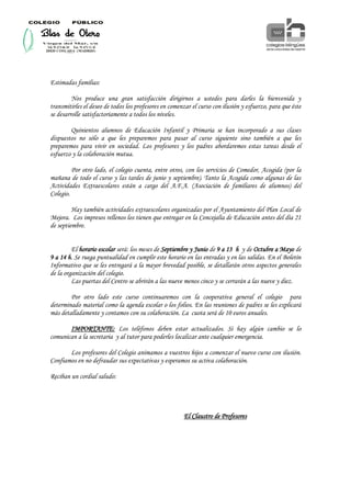 El documento da la bienvenida a las familias al nuevo curso escolar y proporciona información sobre los servicios disponibles como el comedor y actividades extraescolares. También detalla el horario escolar, la cooperativa del colegio, y pide a los padres mantener actualizados sus datos de contacto para emergencias. Finalmente, los profesores animan a los estudiantes a comenzar el curso con ilusión y esperan la colaboración de los padres.