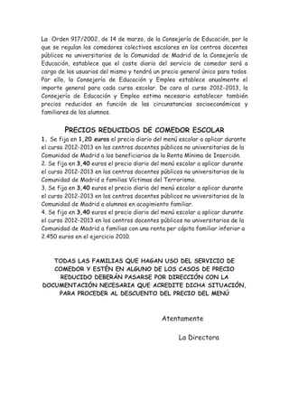 Este documento establece las normas generales para el uso del comedor escolar, incluyendo los horarios, pagos, y precios reducidos. Los estudiantes deben registrarse para el comedor y pagar las cuotas mensuales antes del día 10 de cada mes. El documento también especifica precios reducidos de 1,20€, 3,40€ o 3,40€ dependiendo de la situación socioeconómica de la familia.