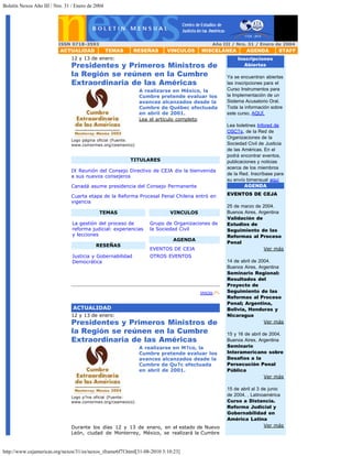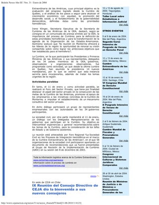 La Cumbre Extraordinaria de las Américas se realizará del 12 al 13 de enero en México para evaluar los avances desde la Cumbre de Quebec de 2001. El boletín también resume la reunión del Consejo Directivo de CEJA, donde se dio la bienvenida a los nuevos miembros y se aprobó el plan de trabajo para 2004, enfocado en estudiar sistemas de justicia y promover la cooperación regional. Canadá asumirá la presidencia del Consejo Permanente de la OEA.