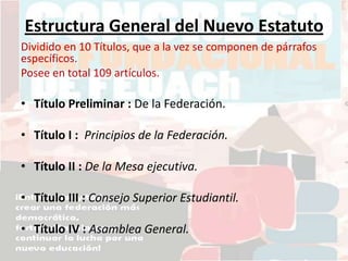 El nuevo estatuto de la Federación de Estudiantes de la Universidad Austral de Chile rediseña su estructura organizativa, dividiéndola en 10 títulos que definen los órganos de representación estudiantil y sus funciones. Se busca fortalecer el rol del Consejo Superior Estudiantil, crear departamentos temáticos administrados por estudiantes, y entregar mayor autonomía a las asambleas de carrera.