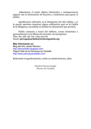 El Papa Benedicto XVI ha concedido un año jubilar a la capilla de la Milagrosa en Carballo, celebrado desde el 4 de septiembre de 2011 hasta el 2 de septiembre de 2012, con el objetivo de fomentar el regreso a la vida cristiana y a los sacramentos. Las celebraciones incluyen misas diarias y eventos especiales, como la coronación de la imagen de la milagrosa y la inauguración de un hogar para madres. Se anima a los catequistas a colaborar en la organización de actividades y celebraciones en torno a este jubileo.