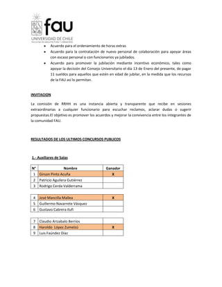 La Comisión de Recursos Humanos de la Facultad de Arquitectura y Urbanismo tiene como objetivos mejorar las condiciones laborales del personal y promover el desarrollo profesional. La comisión, compuesta por representantes del decano y el personal, se reúne cada 15 días. En 2011, la comisión acordó medidas como contratar nuevo personal a través de concursos públicos, ordenar grados y horas extras, e incentivar la jubilación del personal. Adicionalmente, la comisión recibe sugerencias para mejorar la convivencia laboral.