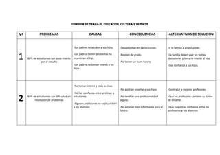 El documento presenta varios problemas que afectan a estudiantes y escuelas, sus causas y posibles soluciones. Algunos problemas incluyen bajo rendimiento escolar debido a falta de apoyo familiar, dificultades en la resolución de problemas por mala enseñanza y venta de comida chatarra en escuelas. Las soluciones propuestas son recibir apoyo psicológico, contratar mejores maestros y limitar la venta de alimentos no saludables.