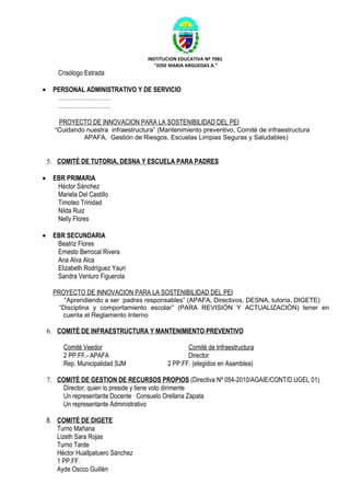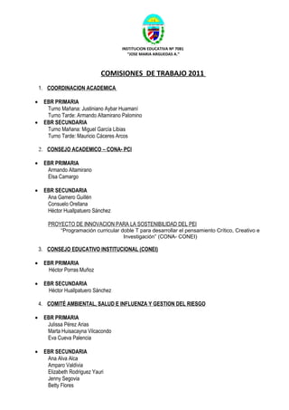 El documento detalla las 20 comisiones de trabajo de la Institución Educativa No 7081 "José María Arguedas A." para el año 2011. Cada comisión se enfoca en un área diferente como coordinación académica, consejo académico, consejo educativo institucional, comité ambiental y salud, comité de tutoría y escuela para padres, entre otros. Para cada comisión se enumeran los miembros que la componen de los niveles primario y secundario.