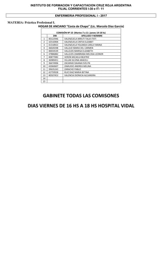 Este documento presenta la distribución de estudiantes de enfermería de la Filial Corrientes del Instituto de Formación y Capacitación Cruz Roja Argentina en diferentes comisiones y lugares para realizar prácticas profesionales de enfermería. Se detallan 15 comisiones asignadas a dos hospitales, un hogar de ancianos y gabinete, con los días y horarios de cada una. Se incluye el nombre y DNI de cada estudiante.