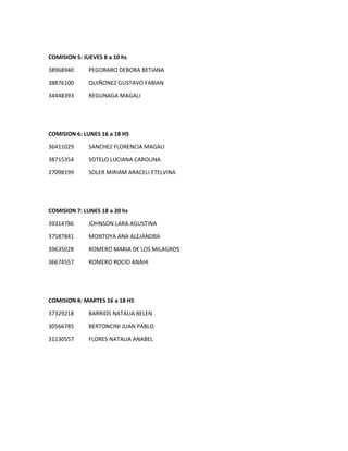 Este documento lista los estudiantes de la Carrera Técnico Superior de Laboratorio de la Filial Corrientes del Instituto Superior Cruz Roja Argentina asignados a 8 comisiones diferentes para su Práctica Profesional III en el Laboratorio de Análisis del Hospital Pediátrico Juan Pablo II, con los días y horarios de cada comisión.