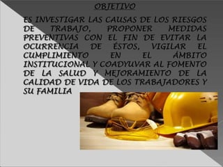 Este documento describe las responsabilidades y funciones de las comisiones de seguridad e higiene en los centros de trabajo según la legislación mexicana. Las comisiones deben investigar las causas de accidentes y enfermedades laborales, proponer medidas preventivas y verificar su cumplimiento. También deben realizar inspecciones periódicas de las instalaciones y áreas de trabajo, y emitir actas con observaciones y recomendaciones para mejorar las condiciones de seguridad e higiene. Su objetivo final es prevenir riesgos laborales e investigar accident