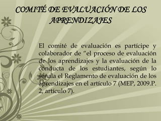 El comité de evaluación de aprendizajes está integrado por docentes designados por la dirección de la institución educativa. En instituciones de primer y segundo ciclo, el comité consiste en tres educadores con representación de asignaturas académicas y complementarias. En instituciones de tercer ciclo y educación diversificada, el comité incluye al director y tres docentes. El comité supervisa la evaluación de estudiantes y ofrece asesoramiento a docentes sobre evaluación.