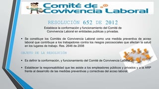 La resolución establece la conformación y funcionamiento de los Comités de Convivencia Laboral en entidades públicas y privadas. Los comités tienen como objetivo prevenir el acoso laboral y promover un buen ambiente laboral. Deben estar conformados por igual número de representantes de los empleados y empleador. Sus funciones incluyen evaluar quejas, realizar recomendaciones y capacitar sobre convivencia laboral.