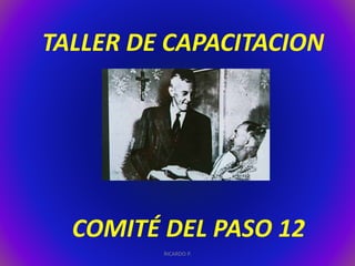 El documento describe los esfuerzos de un comité para promover el Duodécimo Paso de Alcohólicos Anónimos, que consiste en llevar el mensaje de recuperación a otros alcohólicos. El comité planea crear una estructura de trabajo a nivel de grupo, distrito y área para motivar a más miembros a participar en el Duodécimo Paso y mejorar la eficiencia del servicio a través de una base de datos y mejor comunicación. El objetivo final es asegurar que cualquier persona que necesite ayuda tenga acceso al mensaje de AA
