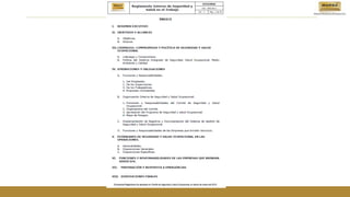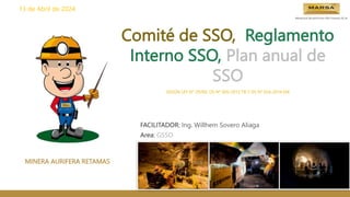 El documento presenta información sobre el Comité de Seguridad y Salud Ocupacional (CSSO) de una empresa minera. Explica que el CSSO es un órgano paritario que representa tanto a la empresa como a los trabajadores. Detalla los temas a tratar en la reunión como la constitución, funciones y vacancias del CSSO, de acuerdo a la ley peruana. También resume los aspectos claves del Reglamento Interno de Seguridad y Salud Ocupacional que el CSSO debe aprobar y revisar periódicamente.
