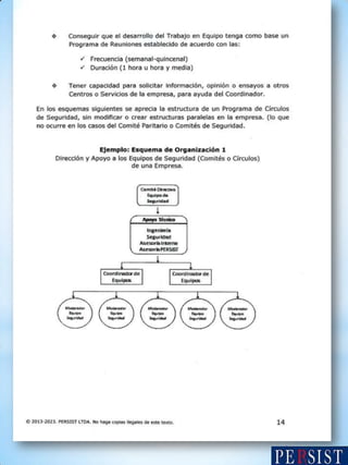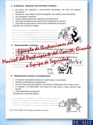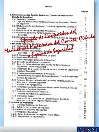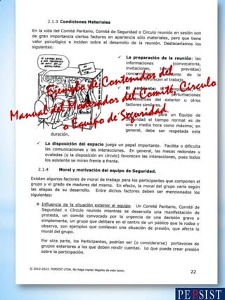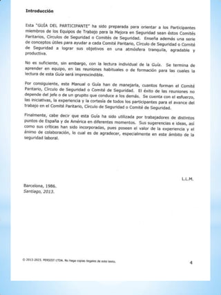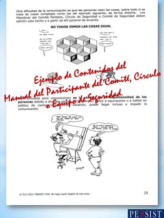 El documento aborda la comunicación y los obstáculos en comités de seguridad, destacando la importancia de escuchar y respetar las ideas de todos los miembros para fomentar la creatividad y la solución de problemas. Se mencionan comportamientos como la falta de atención y la burla que pueden afectar la participación y el desarrollo de nuevas ideas. También se incluye información sobre la propiedad intelectual de los manuales del moderador y participantes.