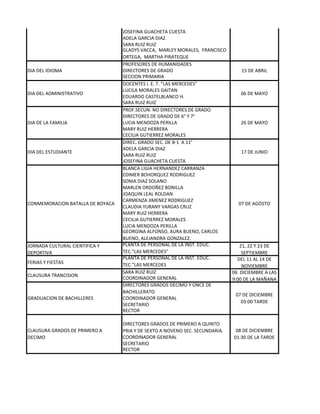 Este documento lista los docentes responsables de proyectos pedagógicos transversales y celebraciones cívicas y culturales en una institución educativa. Se dividen en tres grupos: docentes a cargo de proyectos como convivencia social, orientación sexual y ecología; días cívicos y culturales con sus fechas y responsables; y comités para la elaboración y seguimiento del PEI organizados por gestión administrativa, directiva, académica y comunidad.