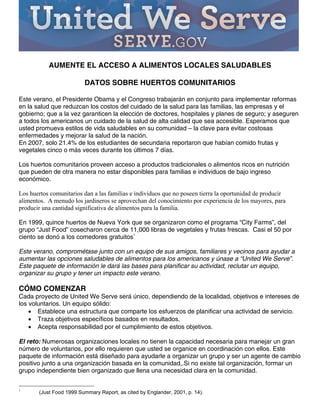 Este documento proporciona información sobre huertos comunitarios y sugiere formas en que los voluntarios pueden ayudar a aumentar el acceso a alimentos saludables locales. Recomienda establecer objetivos medibles, como cultivar una cierta cantidad de tierra o donar libras de productos a bancos de alimentos. También aconseja identificar socios locales como huertos comunitarios existentes y ofrece consejos para organizar un equipo de voluntarios y llevar a cabo actividades de servicio.