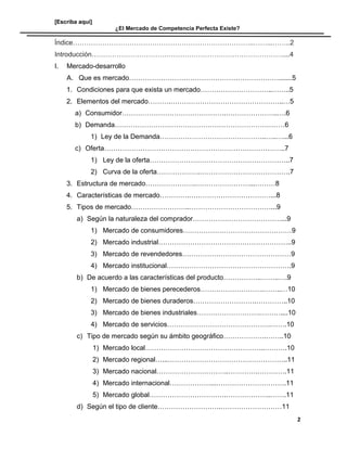 Este documento analiza el mercado de competencia perfecta. Explica que un mercado requiere oferta, demanda, compradores y vendedores. Describe las características de la competencia perfecta, como un gran número de empresas pequeñas, homogeneidad de productos, libre entrada y salida del mercado. Concluye que aunque la competencia perfecta es teóricamente ideal, rara vez se da en la práctica debido a limitaciones del mundo real.