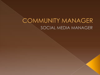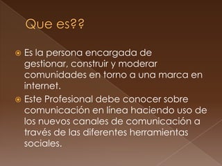 El documento describe las responsabilidades y habilidades de un Community Manager. Un Community Manager es responsable de gestionar y moderar comunidades en línea para una marca, utilizando herramientas sociales para comunicarse y defender los intereses de los clientes. También deben tener habilidades de marketing, relaciones públicas y comunicación para crear contenido valioso que reúna a la comunidad en torno a los productos y servicios de una marca.