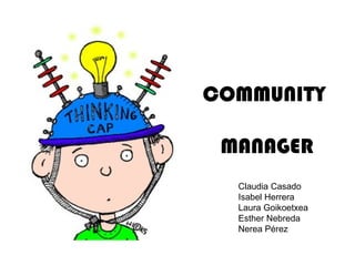 Este documento describe el rol del community manager y sus principales funciones. Un community manager es responsable de crear y gestionar perfiles de la empresa en redes sociales, escuchar comentarios, hacer crecer la comunidad online, distribuir contenido relevante y participar en conversaciones para humanizar la relación con los clientes. Se espera que tengan características como ser extrovertidos, amables, simpáticos, comprometidos, respetuosos e innovadores.
