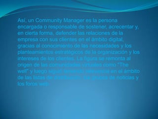 Un community manager es la persona responsable de gestionar las relaciones de una empresa con sus clientes en el ámbito digital a través de redes sociales y comunidades en línea. Sus funciones incluyen crear estrategias de comunicación digital, proteger la identidad de la marca, promover contenidos, analizar métricas y asegurar una comunicación transparente que involucre a los clientes con la marca.