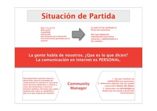Este documento describe las estrategias y actividades de un equipo de gestión de medios sociales y comunidad. En resumen: 1) El equipo coordinará contenidos generados por usuarios, determinará objetivos para desarrollar bases de datos de usuarios, y desarrollará una estrategia de display para fomentar conversaciones. 2) Las actividades incluyen conectar con audiencias e influencers, gestionar perfiles y blogs, y monitorear la reputación online a lo largo de varias fases. 3) El objetivo final es involucrar a diferentes tipos de usu
