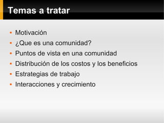 El documento presenta la teoría del 'community-scrum manager' como un modelo de colaboración entre comunidades y equipos de trabajo, explorando la motivación, la estructura de las comunidades y la relación entre necesidades y satisfactores. Se analiza la importancia de la gestión de la entropía social y la necesidad de equilibrar los roles entre usuarios y desarrolladores dentro de estas comunidades. Se concluye que las comunidades necesitan adaptarse y evolucionar orgánicamente para evitar la competencia y el deterioro por fricciones internas.
