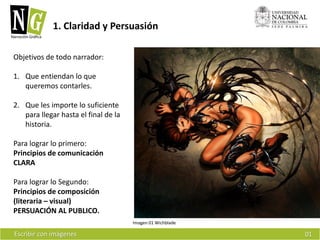 Este documento discute los principios de claridad y persuasión necesarios para escribir historias en forma de cómics. Explica que para lograr claridad se requiere aplicar principios de comunicación efectiva, mientras que para lograr persuadir al público se necesita aplicar principios de composición literaria y visual. Luego detalla varias decisiones clave que los creadores de cómics deben tomar con respecto al momento, encuadre, imagen, palabra y flujo para transmitir de manera efectiva la historia a través de imágenes en secuencia.