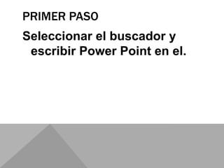 Buscar Power Point en un buscador, seleccionar el programa y comenzar a crear una presentación agregando información relevante al tema que se presentará.