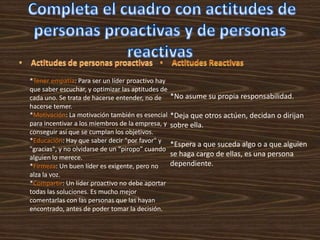 Un líder proactivo debe tener empatía, motivar a los demás, ser educado pero firme, y compartir las soluciones en lugar de imponerlas. Un líder asume responsabilidad por sus acciones en lugar de culpar a otros y persuade a la gente a trabajar juntos en lugar de obligarlos. Ser proactivo significa asumir control y responsabilidad para iniciar acciones creativas y audaces para generar mejoras.