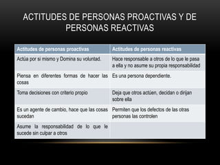 El documento contrasta las actitudes de personas proactivas versus reactivas. Las personas proactivas actúan por sí mismas, dominan su voluntad, piensan en diferentes formas de hacer las cosas, toman decisiones por su cuenta y asumen responsabilidad por los resultados sin culpar a otros. Por el contrario, las personas reactivas dejan que otros dirijan sus acciones, dependen de los demás y culpan factores externos por lo que les ocurre.