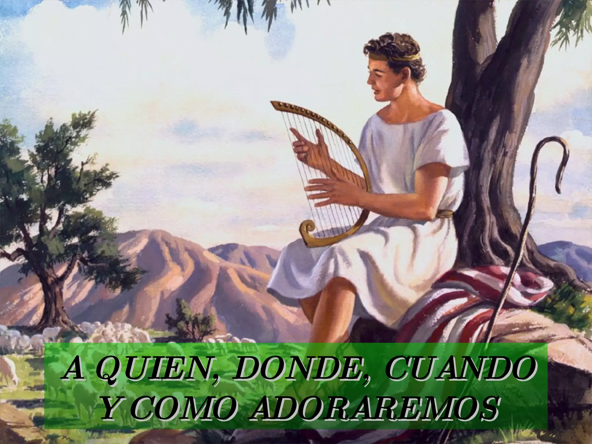 El documento habla sobre los principios bíblicos de la adoración a Dios. Explica que la adoración involucra postrarse ante un ser supremo y que en la Biblia se refiere a alabar a Dios. Describe cómo la adoración comenzó en el Edén y luego incluyó sacrificios. También analiza los instrumentos musicales y estilos de adoración aceptables versus los no aceptables según la Biblia. Concluye resaltando que debemos adorar a un Dios santo en lugares santos separados por Él y sigui
