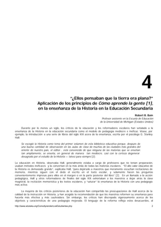 El documento describe cómo los maestros de historia pueden transformar los temas y objetivos curriculares en problemas históricos para involucrar a los estudiantes en el pensamiento histórico. Explica que los historiadores se enfocan en problemas e interrogantes, y que los maestros deberían hacer lo mismo para motivar a los estudiantes. Usando un estudio de caso sobre Colón y la tierra plana, muestra cómo formular problemas históricos y diseñar herramientas cognitivas para ayudar a los estudiantes a abordar contenido histó