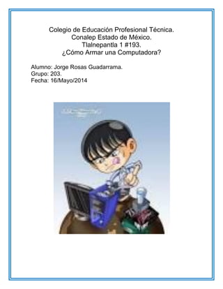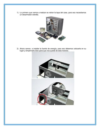 Este documento proporciona instrucciones paso a paso para ensamblar una computadora. Explica cómo instalar componentes como la fuente de alimentación, la CPU, la memoria RAM, las tarjetas de video y red, las unidades internas como el disco duro y la unidad óptica, y cómo conectar todos los cables. El autor concluye que aprendió los elementos básicos de una computadora y cómo ubicarlos correctamente para ensamblar un equipo de manera adecuada.