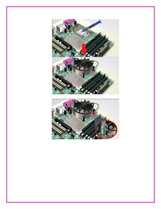 Este documento proporciona un manual de 16 pasos para ensamblar una computadora. Instruye sobre cómo instalar componentes como la fuente de alimentación, la CPU, la memoria RAM, las tarjetas de video y red, las unidades internas como el disco duro y la unidad óptica, y finalmente conectar todos los cables y periféricos necesarios. El propósito es enseñar a los estudiantes cómo armar una computadora de manera correcta y funcional.