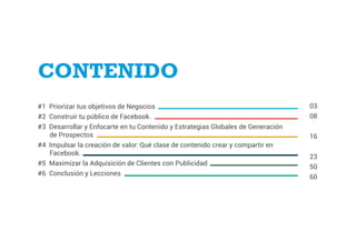 El documento presenta una guía sobre cómo atraer clientes a través de Facebook, enfatizando la necesidad de establecer objetivos comerciales claros y construir una audiencia comprometida. Se discuten estrategias de contenido y publicidad para generar prospectos, destacando la importancia de crear valor y no centrarse únicamente en las ventas directas. Además, se sugiere una combinación de contenido que fomente la interacción y la conexión emocional con los usuarios para maximizar la adquisición de clientes.