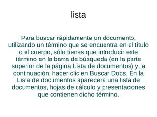 Este documento proporciona instrucciones para buscar documentos en Google Drive utilizando varios métodos como introducir términos de búsqueda, revisar documentos editados recientemente, buscar en la papelera, abrir carpetas específicas y buscar documentos compartidos con colaboradores específicos. También explica cómo limitar los resultados de búsqueda a un idioma o país particular.