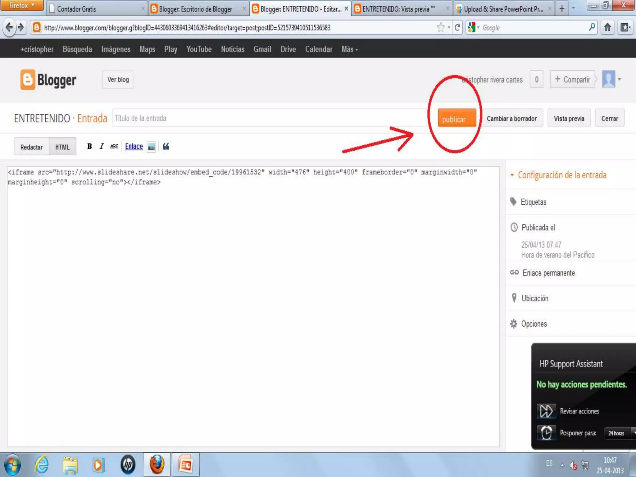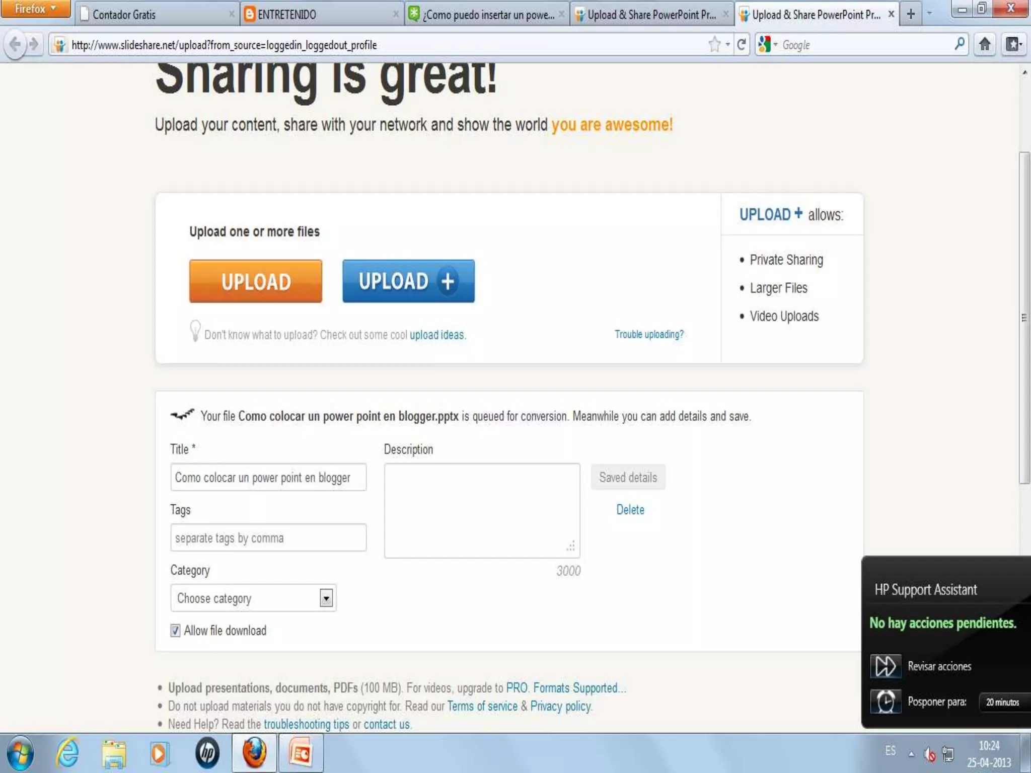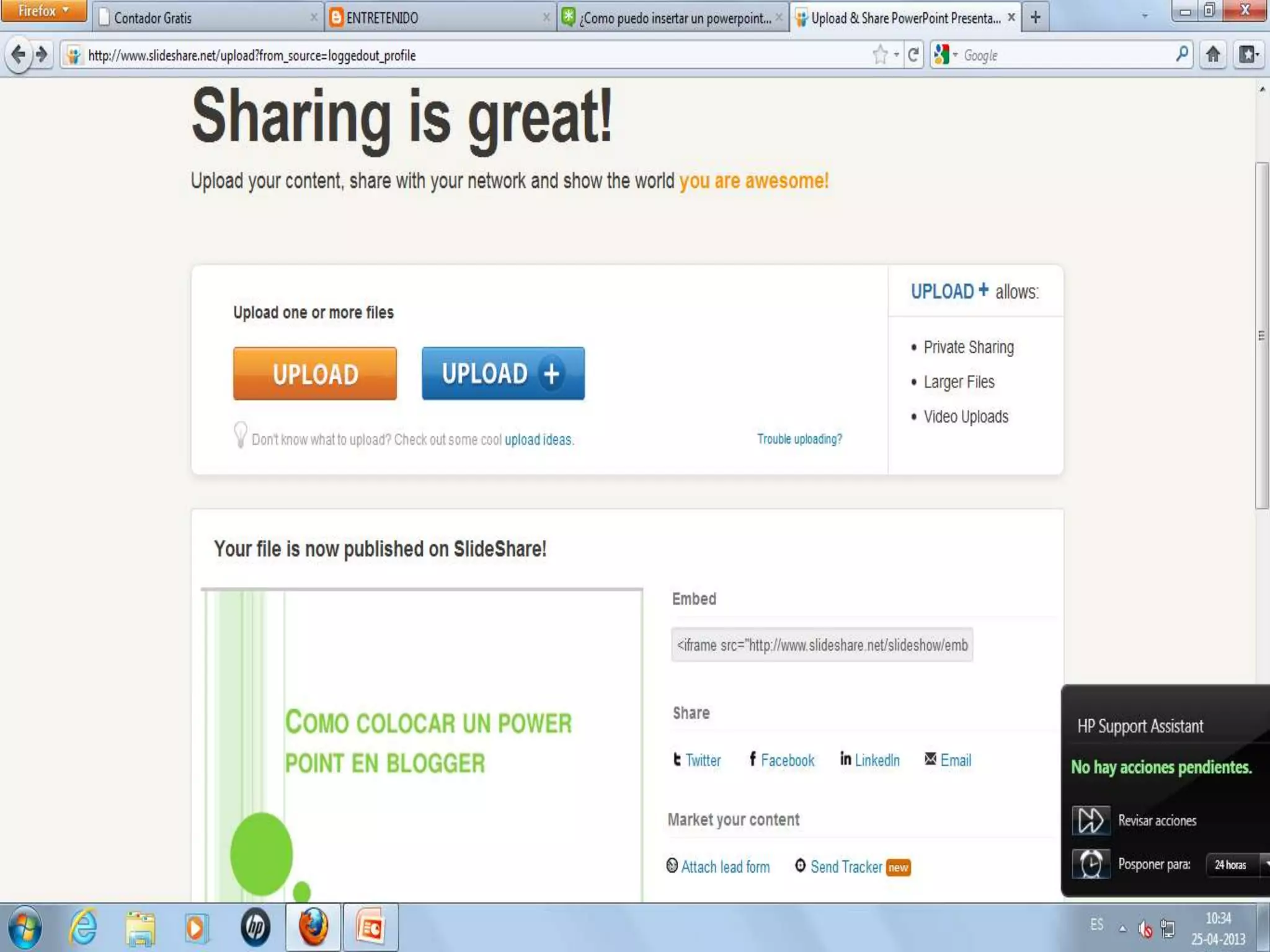 El documento proporciona 11 pasos para colocar un PowerPoint en Blogger: 1) crear un PowerPoint, 2) subirlo a SlideShare, 3) elegir el archivo, 4) agregar una descripción y categoría, 5) copiar el enlace proporcionado, 6) crear una nueva entrada de blog, 7) pegar el enlace en el área HTML, 8) publicar la entrada. El propósito es explicar el proceso de compartir un PowerPoint en un blog a través de SlideShare.