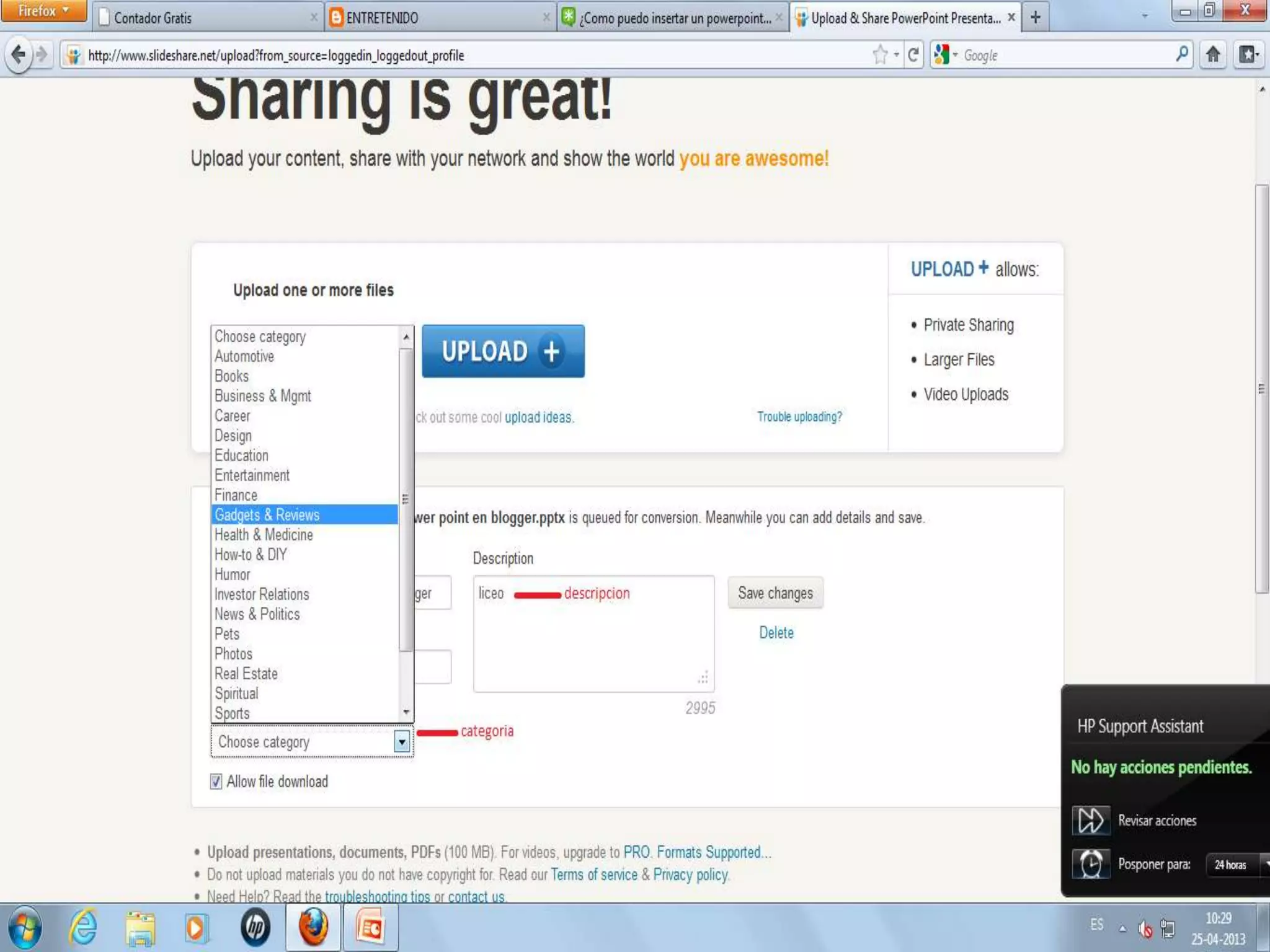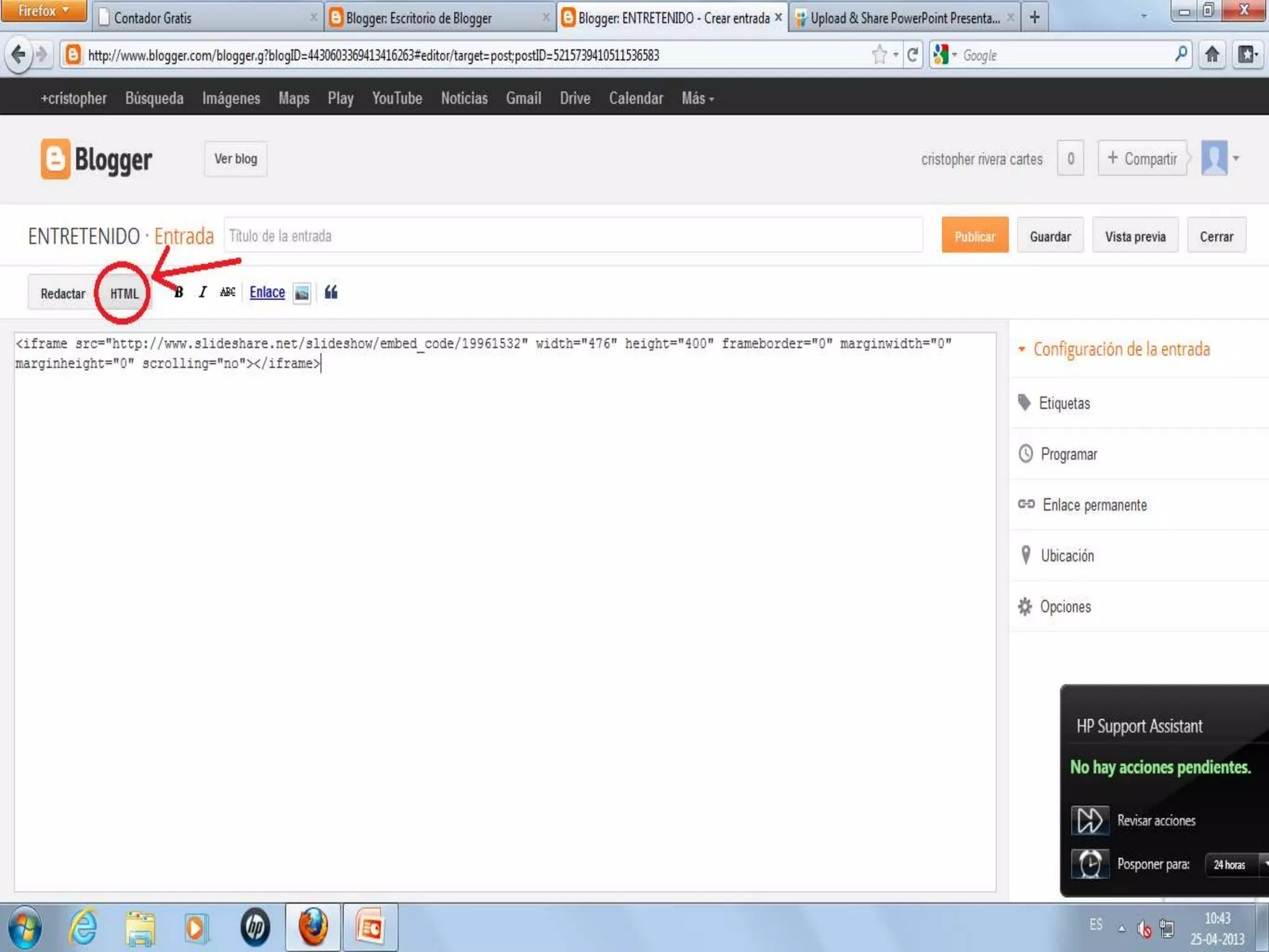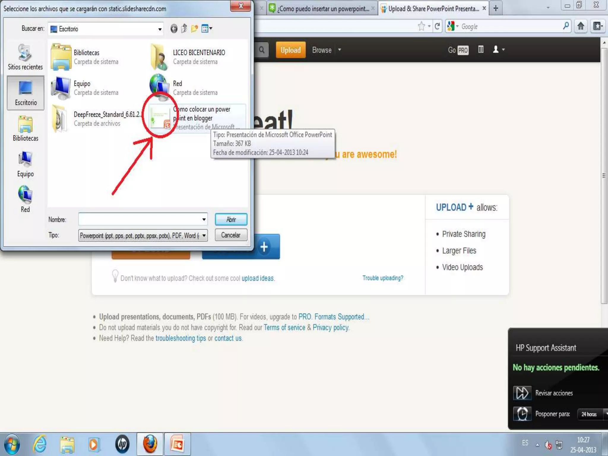 El documento proporciona 11 pasos para colocar un PowerPoint en Blogger: 1) crear un PowerPoint, 2) subirlo a SlideShare, 3) elegir el archivo, 4) agregar una descripción y categoría, 5) copiar el enlace proporcionado, 6) crear una nueva entrada de blog, 7) pegar el enlace en el área HTML, 8) publicar la entrada. El propósito es explicar el proceso de compartir un PowerPoint en un blog a través de SlideShare.