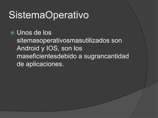 Este documento resume algunas características clave de los smartphones, incluyendo que los sistemas operativos Android e iOS son los más utilizados debido a su gran cantidad de aplicaciones, que la tecnología de pantalla táctil avanza más rápido que la de teclado debido a nuevos materiales y mayores resoluciones, y que la calidad de llamada mejorará a medida que avance la tecnología pero depende de las pruebas individuales, mientras que los precios y cargos mensuales varían según la compañía telefónica
