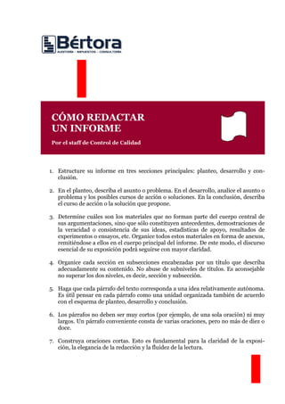 El documento proporciona instrucciones para redactar informes de manera efectiva. Sugiere estructurar el informe en tres secciones (planteo, desarrollo y conclusión), organizar la información en subsecciones y párrafos coherentes, y usar un lenguaje claro y conciso para facilitar la comprensión del lector. También recomienda fundamentar las propuestas con datos confiables y considerar los aspectos de presentación para mejorar la calidad del informe.